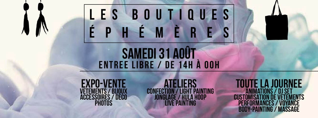 LES BOUTIQUES EPHEMERES ont pour objet de réunir le temps d’une journée dans un même lieu des artistes et artisans créateurs de vêtements, de bijoux et accessoires mais également des photographes, des peintres, des graffeurs....et de leur offrir un espace pour présenter leur travail au public de manière directe.